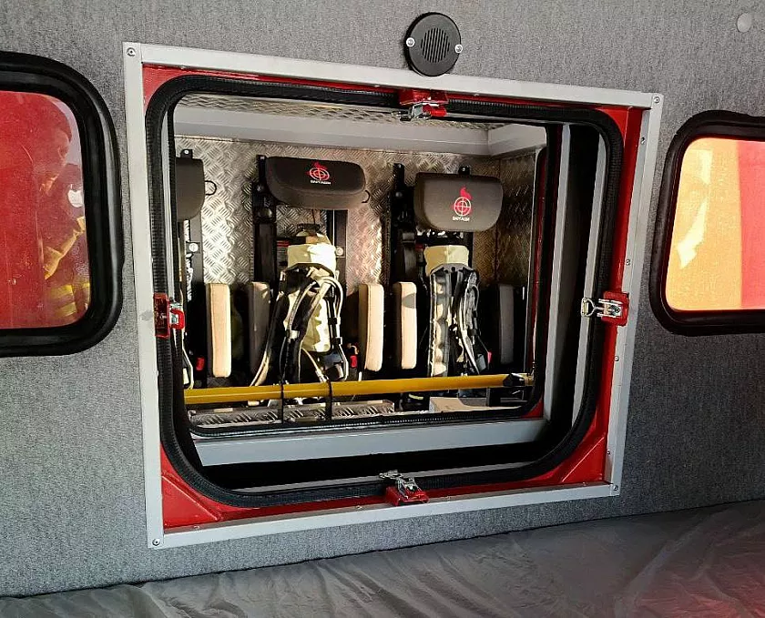 Новая техника отличается внушительными резервуарами для воды (8 кубических метров) и пенообразователя (1 кубический метр). На крыше машины установлена стационарная водяная пушка, способная выбрасывать 60 литров воды в секунду, а передний бампер оборудован дополнительным стволом, подающим 20 литров в секунду.