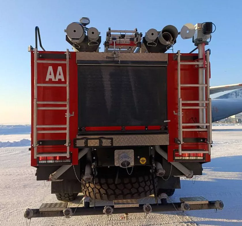 Уточняется, что автомобиль оснащен системой пенного покрытия взлетно-посадочной полосы, позволяющей создавать полосу шириной 8 метров за один проезд. Также в арсенале машины имеется установка углекислотного тушения и выдвижная телескопическая вышка с LED-прожекторами для проведения работ в ночное время.